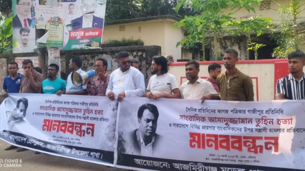 আজমিরীগঞ্জে সাংবাদিক তুহিন হত্যার প্রতিবাদে মানববন্ধন