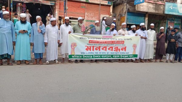 সুনামগঞ্জে জমিয়ত নেতা হত্যার প্রতিবাদে বাহুবলে মানববন্ধন